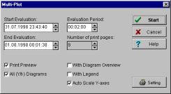 The option ăMulti-PlotŇ allows to print several pages of Y/t diagram automatically from a saved measurement The program determines the number of pages to be printed from the evaluation period and time. Overview diagram, legends etc. may be printed. |