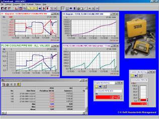 In the general view, 32 different diagrams may be displayed together. A maximum of 3 Y-axes may be plotted. The axes scalation may be choosen as desired. Diagram title, line colors and line types may be modified individually. Limiting value violations in digital and column diagram are indicated through change of color. Important diagram related functions are available via buttons in the toolbar, ex.: -Start/stop measuring -Auto scale X- and Y- axes -Arrange diagrams, entire screen view -Print preview |