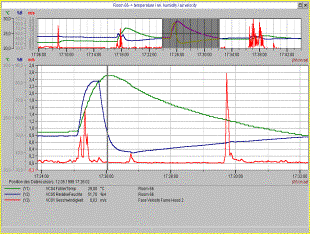 The overview diagram at the upper part of the screen shows the complete measurement period The highlightened measurement data segment above is shown in the zoom window below. The legend shows detailed informations like name, sensor type, dimension and text description for every measuring value The current measuring value located at the measurement data line will be displayed in the legend. Limiting value violations are red (maximum value) or blue (minimun value). Legends and overview diagram may be switched ON/OFF. |